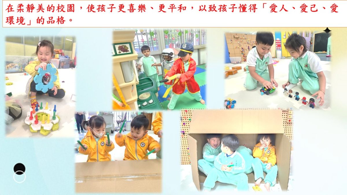 Our school emphasizes the balanced development of nurturing young children: promoting moral education; strengthening the diversity of caring for young children and promoting close communication from different cultures; advicating the theme of living through the various learning areas; advocating young children to learn from games and enhancing the link between pre-school education and primary education.