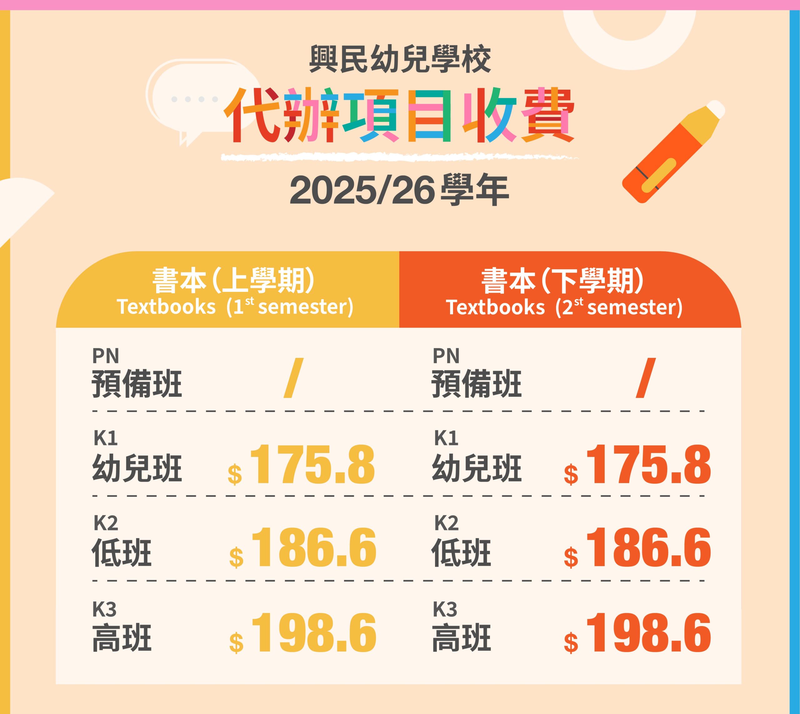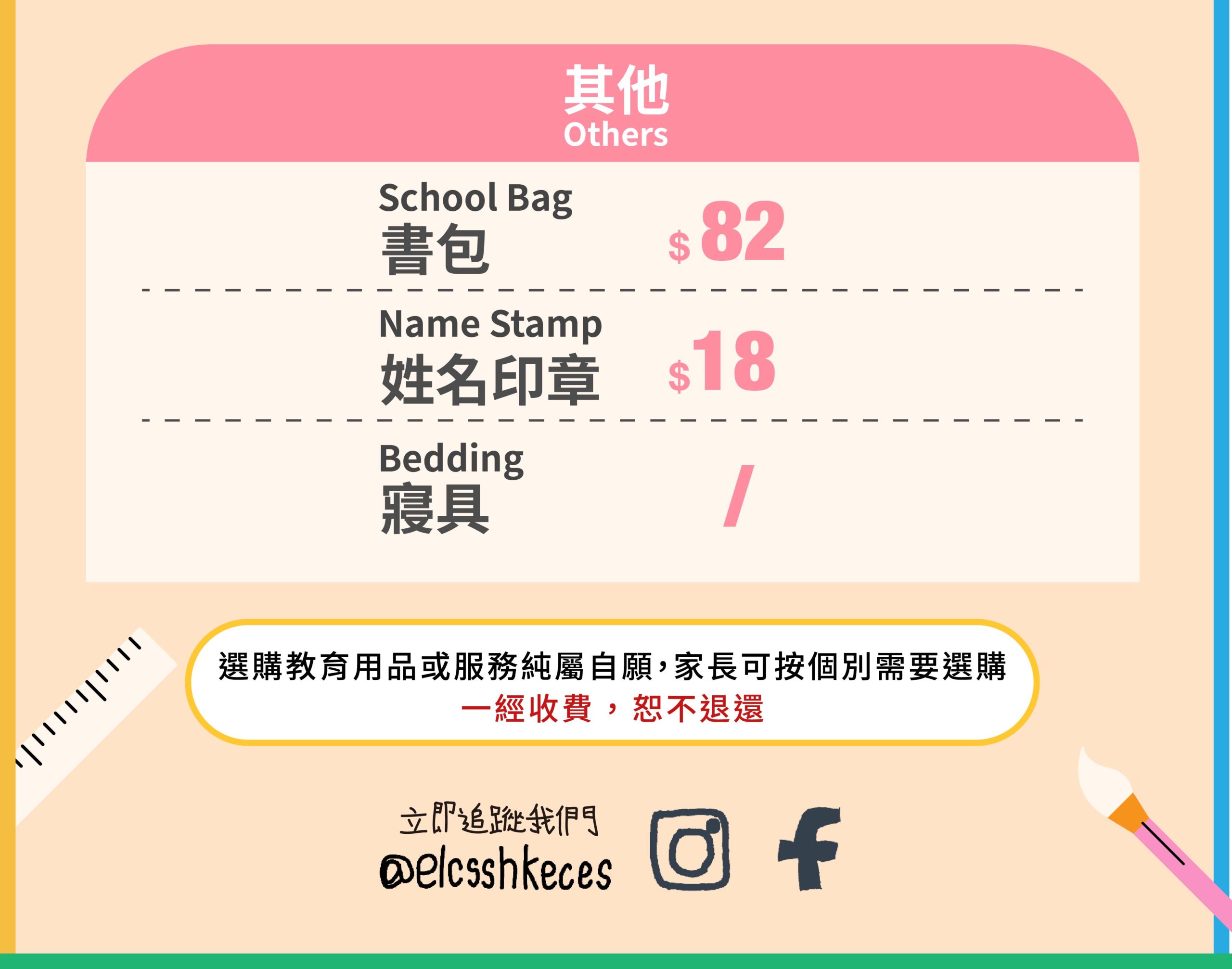 代辦項目收費 2025/26學年 報名詳情 代辦項目收費 25/26年度各級收費 書本收費 上學期 及 下學期 輔助教材及習作收費 上學期 及 下學期 校服收費 夏季運動服 及 冬季校服 其他收費 報名詳情