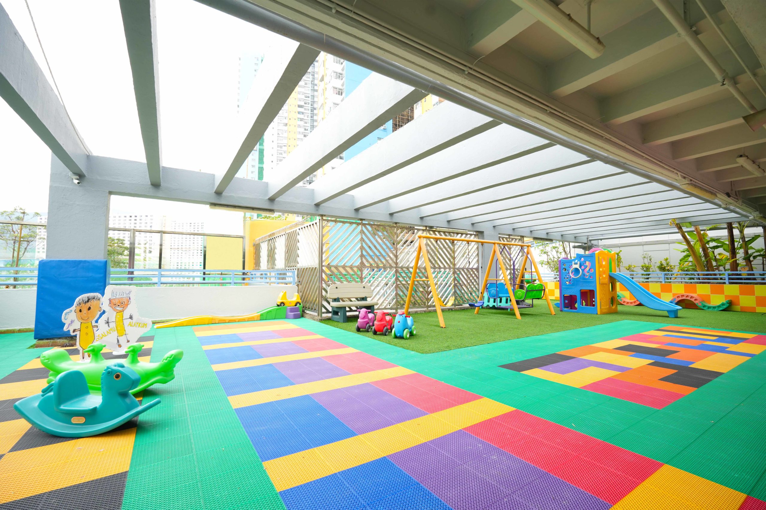 廣闊的戶外大肌肉場地,鋪設安全軟墊,設有鞦韆、滑梯、攀登架、單車活動區及花園,讓學生在陽光下遊戲,鍛鍊身體協調,與自然對話。